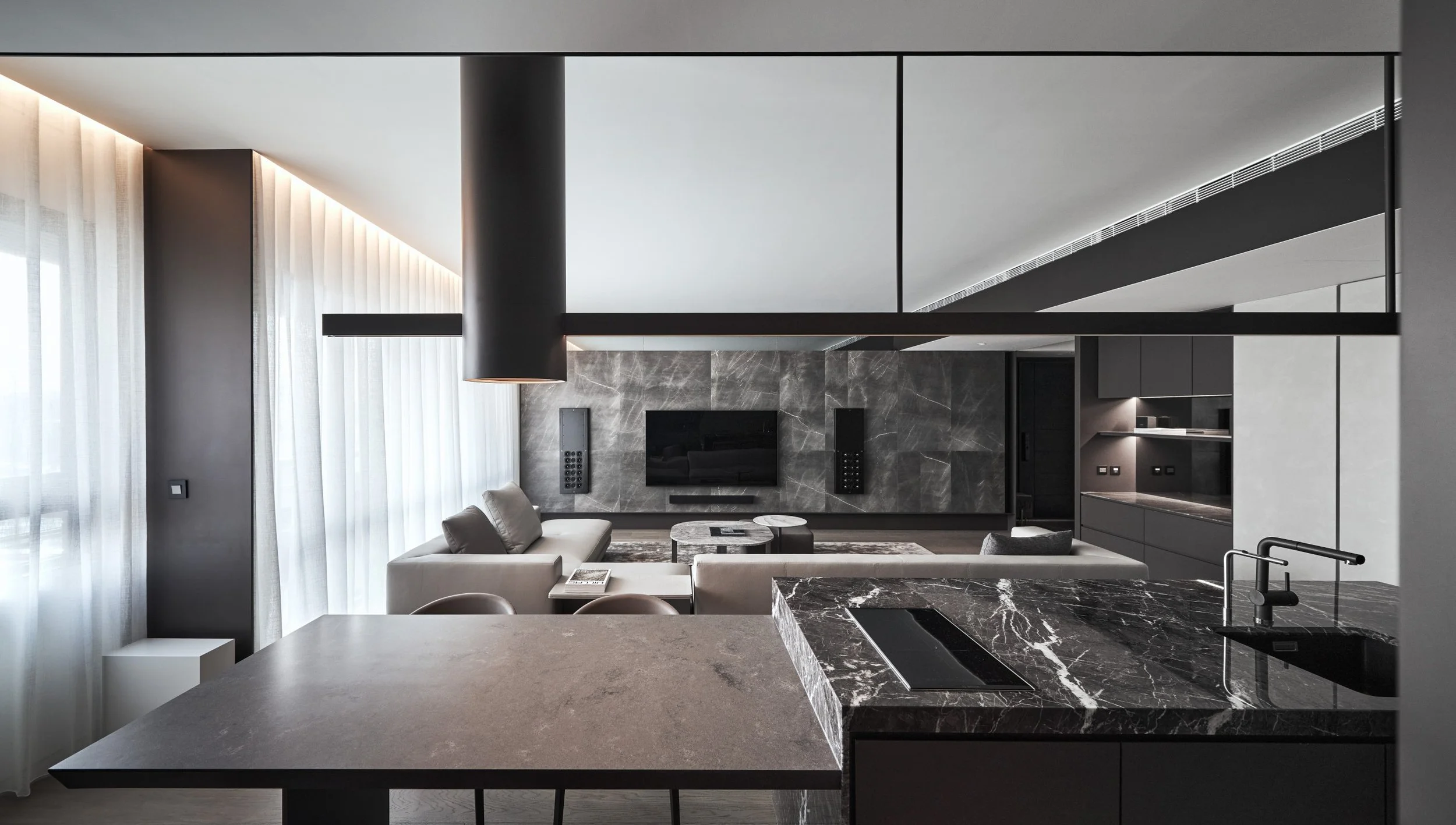 The slimline design of the loudspeakers lends itself perfectly to the minimalistic, interior space, with the speakers blending in perfectly with the contemporary feel of the room.