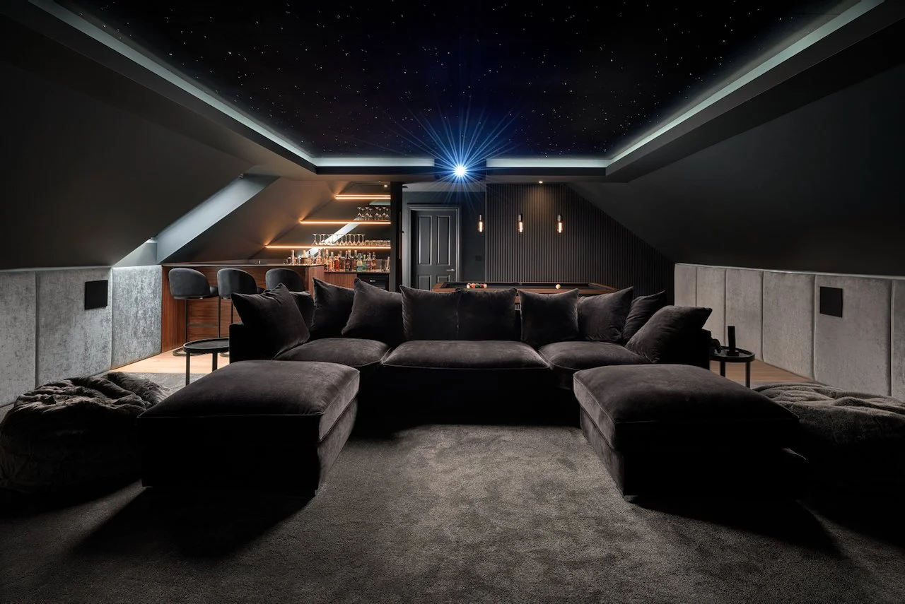 The new screen is bigger and better, the surround sound is sharper and more immersive, and everything is so easy to use with the Savant remote. The star ceiling adds real atmosphere, and the bar and games area make it a space we use much more as a family.