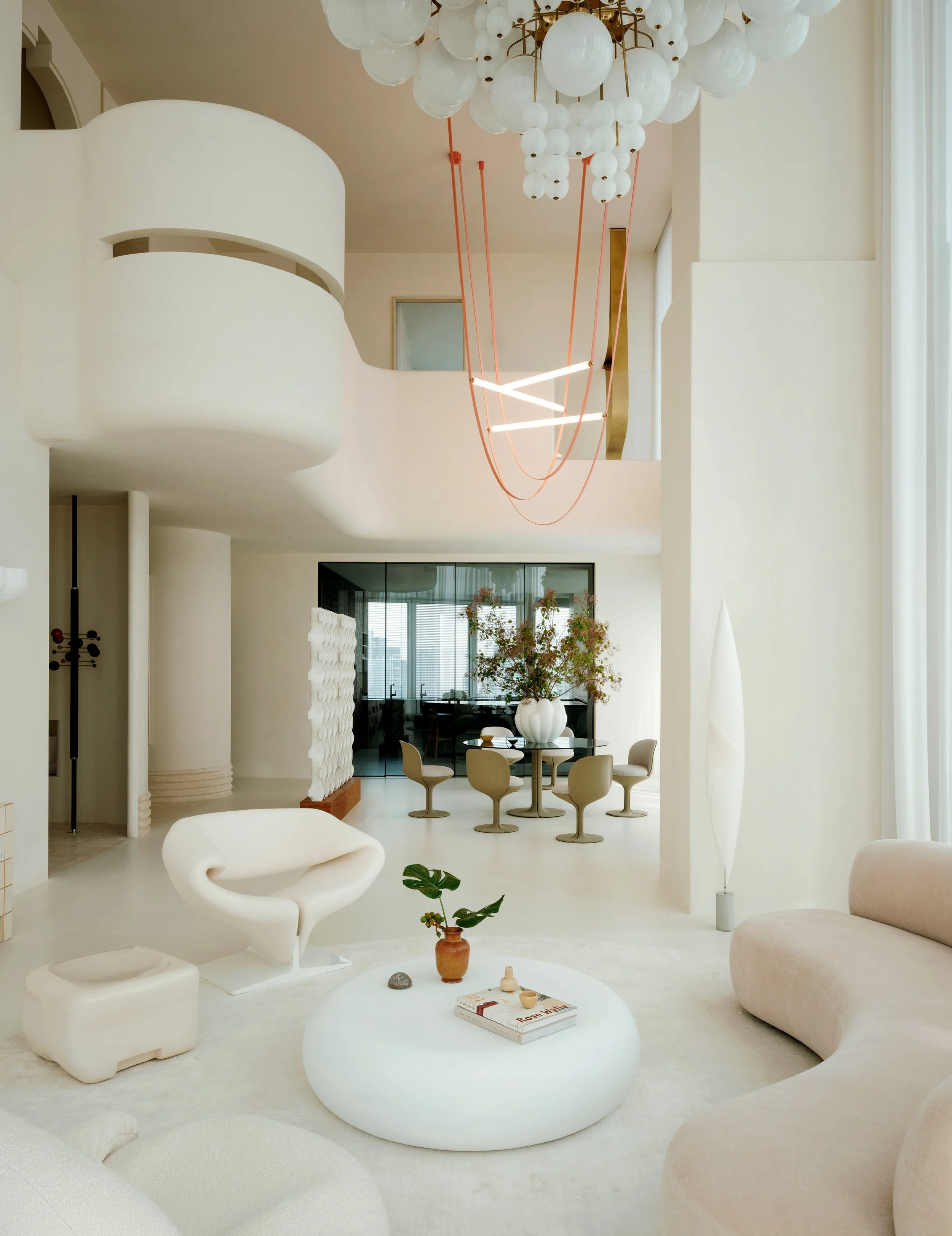 Wang Ju crafted a neutral white box with a gentle approach, using expansive floor-to-ceiling windows to let light and views become the home's most vital regulators. In fact, many of the home's lights and furniture are collectible designs, and even the artwork was created specifically for this space. Through communication with designers and artists, creation of drafts, and final realization, what you see is precisely the ideal vision.