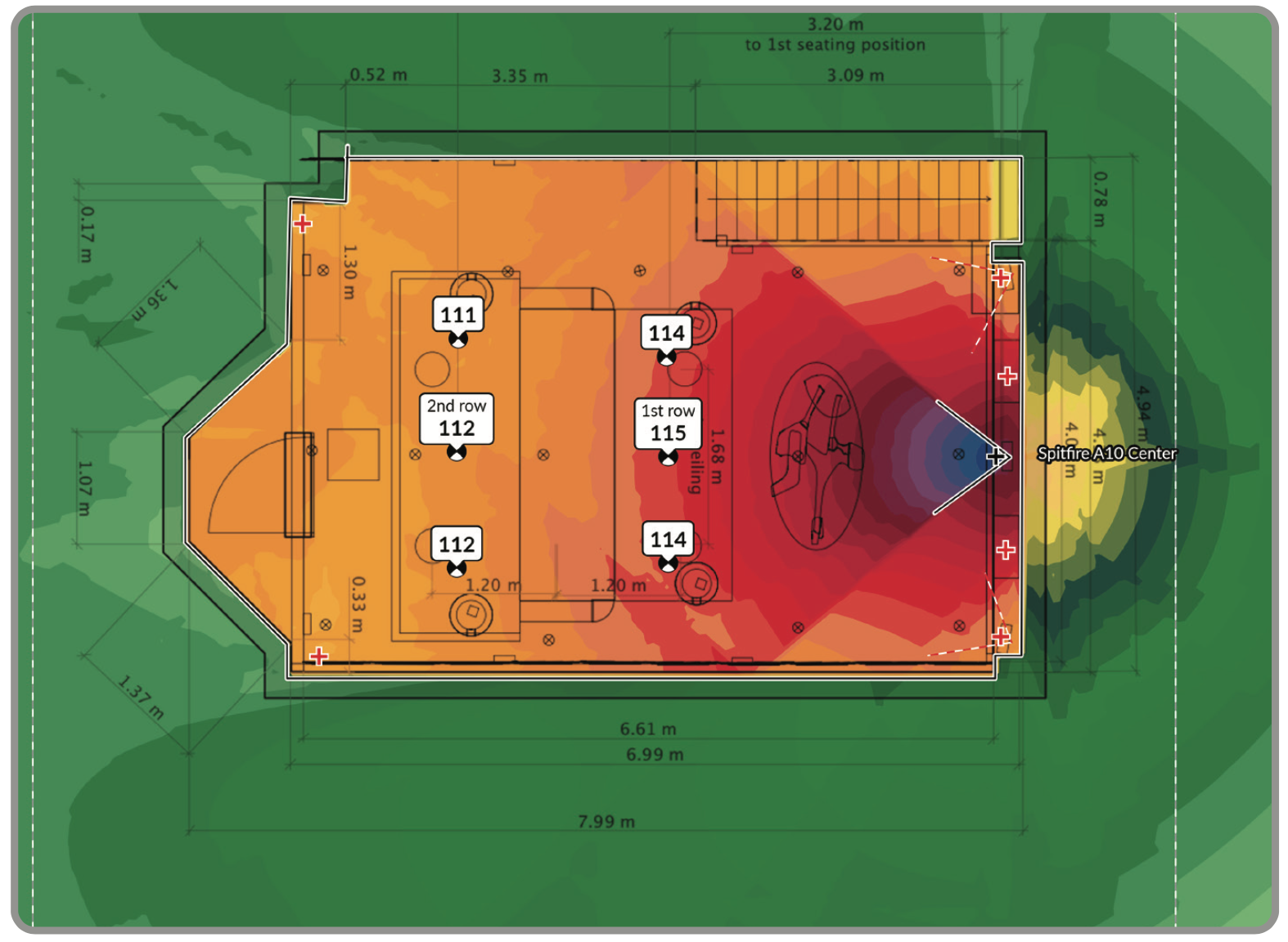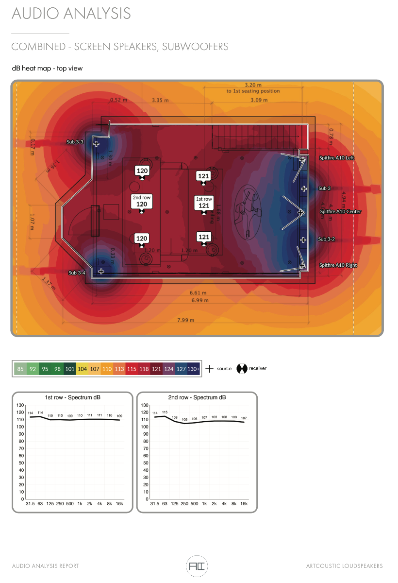 Artcoustic's Audio Analysis Service is requested on many projects, helping to predict output, consistency between seating locations, bass response in room (and solutions for problematic room modes) and more. This ensures that what we promise at the sales stage is delivered upon hand over. With SPL of 105db required from the speakers, we can see we have enough headroom (7db at least - Dolby and CEDIA ask for 6db headroom for calibration) to EQ the curve perfectly. Bass exceeds the 115db (Dolby and CEDIA's requirement for +10db above the centre channel) requirements here too, giving us, Cyberhomes and crucially, the client - the confidence to know that their exciting cinema room is properly designed from the very start.
