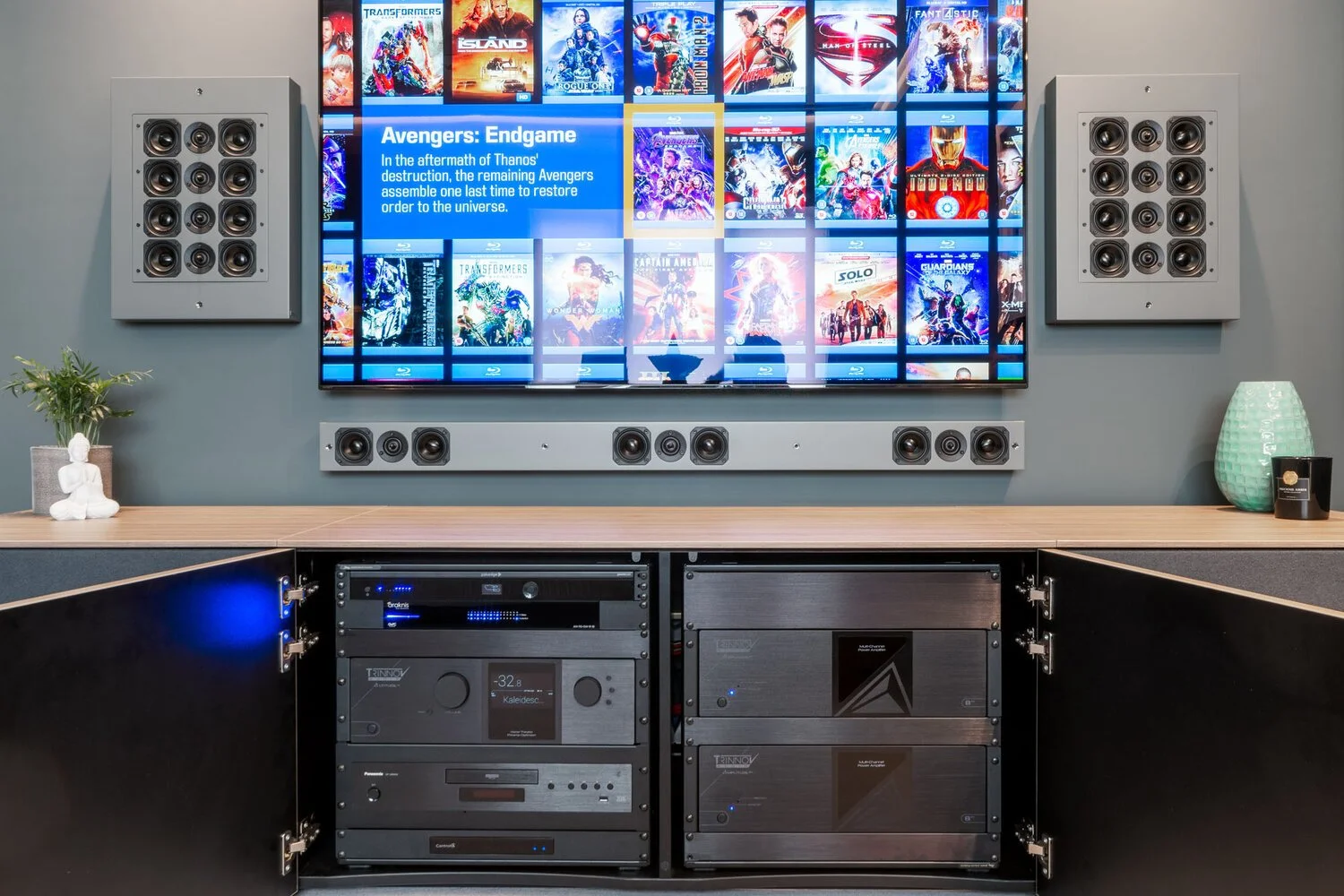 The specialised AV furniture that houses two powerful Artcoustic PS2 subwoofers, the Trinnov Altitude 16 processor, Amplitude 8M power amps, Kaleidescape system, power management and networking equipment. All of the Artcoustic speakers that are visible in the room are colour matched to the Farrow & Ball wall colour. Those that are not on show are recessed within the walls and covered by acoustic wall paneling that is colour matched to the same fabric used on the AV unit for a unified look.