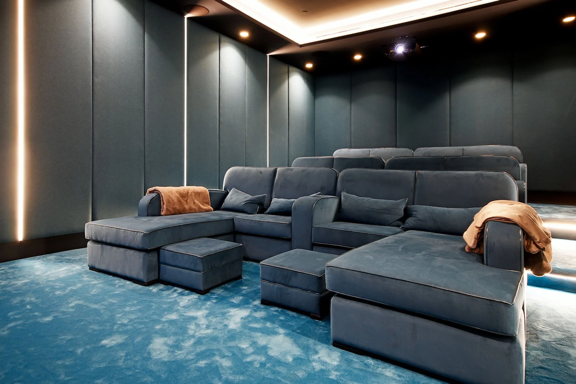 The clients constructed a brand-new property with various entertainment facilities in the basement, including a cinema room, swimming pool, sauna, jacuzzi, games room, and gym. From the beginning, they had intended to include a dedicated cinema room with tiered seating as a focal point to entertain their family and friends. Given their love for movies, it held significant importance within the overall construction plans. Working with interior designer Robert Ernstzen (Ernstzen & Ernstzen Limited), the end results are superb.