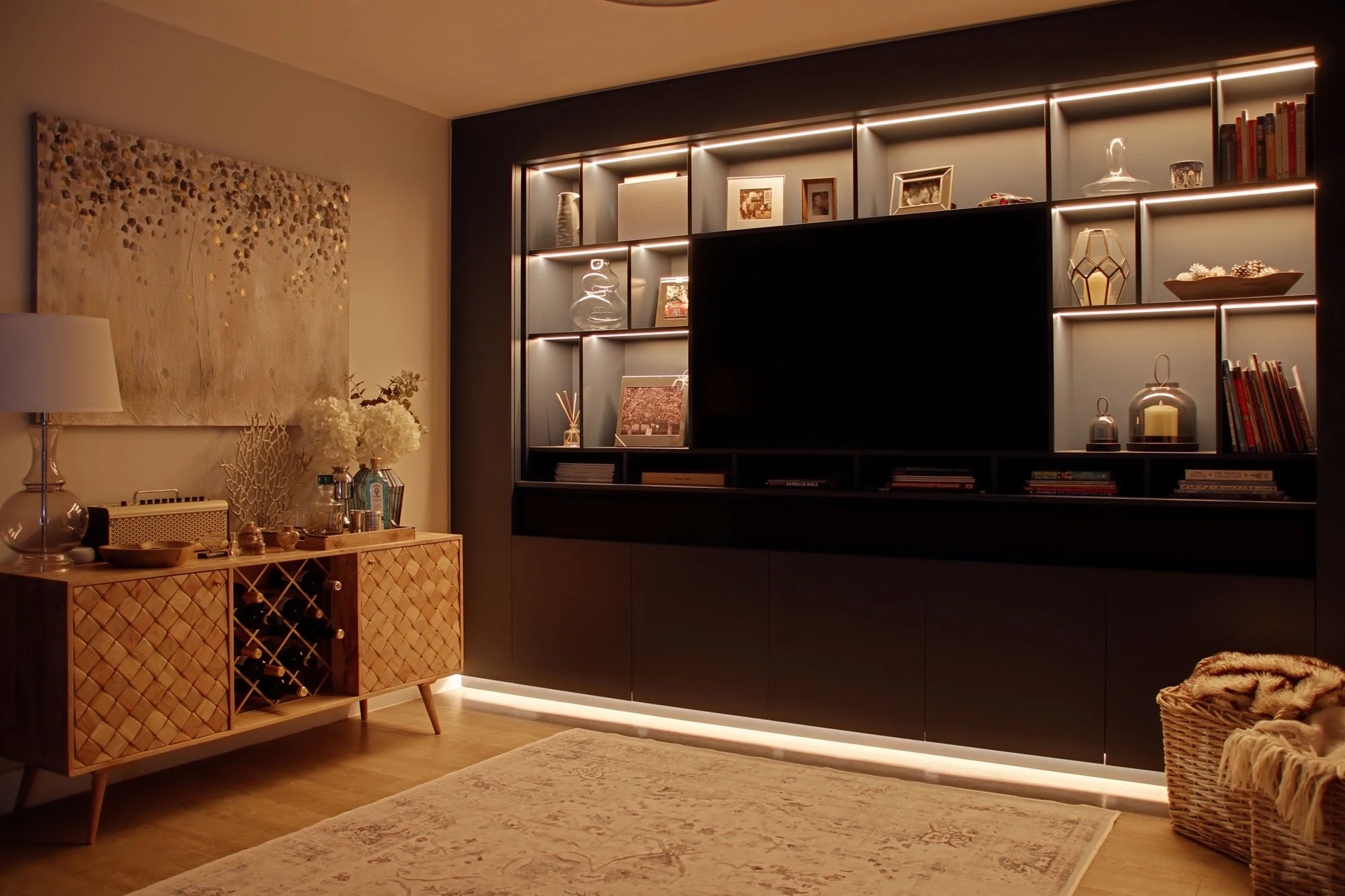 The bespoke Artcoustic HSPL Soundbar was specified to accommodate the custom width of the drop-down screen and to integrate as part of the furniture when not in use. This design detail allows the loudspeakers to blend in perfectly with the room's decor, offering a the perfect harmony of design and performance.